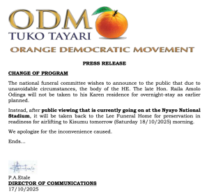 The committee planning the state funeral for the late former Prime Minister Raila Odinga has resolved not to take his remains for a night vigil at his home in Karen, Nairobi County.